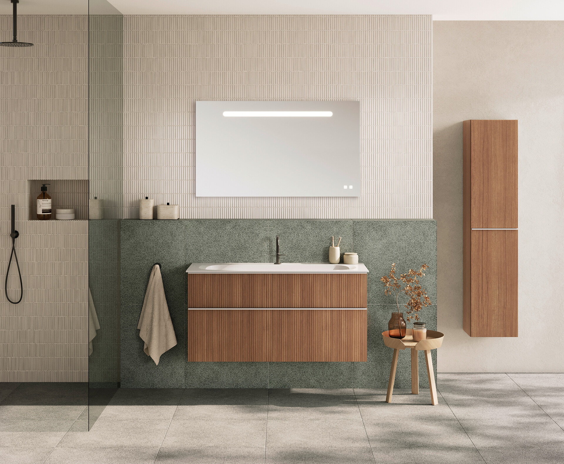 Für das Badezimmer hat Designer Patrick Frey diesen Trend zusammen mit burgbad nun praxistauglich umgesetzt: Statt der horizontalen Profilierung mit Plisseefronten bei der Originalkollektion Fiumo zeigen die neuen Fronten von Fiumo 2.0 ein vertikales Muster. Die eingefräste, thermofolierte Oberflächenstruktur wirkt dabei eher filigran als robust – ein feines Linienmuster, das dem Möbel mit seinem Schattenspiel Lebendigkeit verleiht und es weniger massiv wirken lässt. Typisch burgbad: Mit den weich ausgearbeiteten Kanneluren ist das Oberflächenrelief nicht nur besonders pflegeleicht, sondern erweist sich auch als echter Handschmeichler.